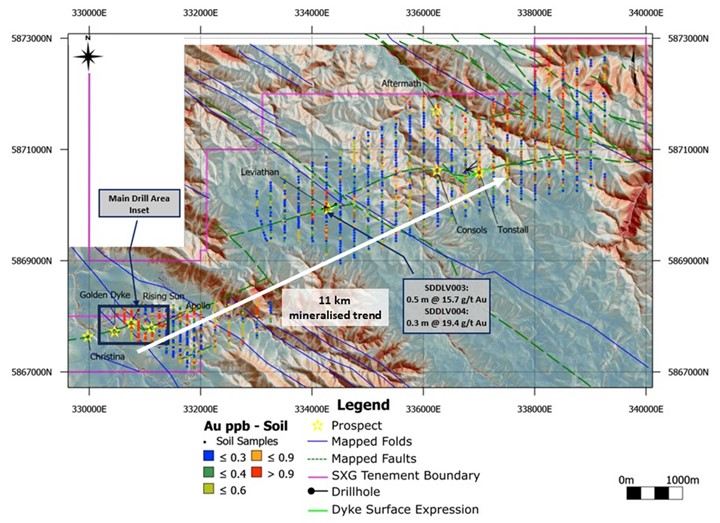 Figure 4: Sunday Creek regional plan view showing LiDAR, soil sampling, structural framework, regional historic epizonal gold mining areas and broad regional areas (Tonstal, Consols and Leviathan) tested by 12 holes for 2,383 m drill program. The regional drill areas are at Tonstal, Consols and Leviathan located 4,000-7,500 m along strike from the main drill area at Golden Dyke- Apollo.