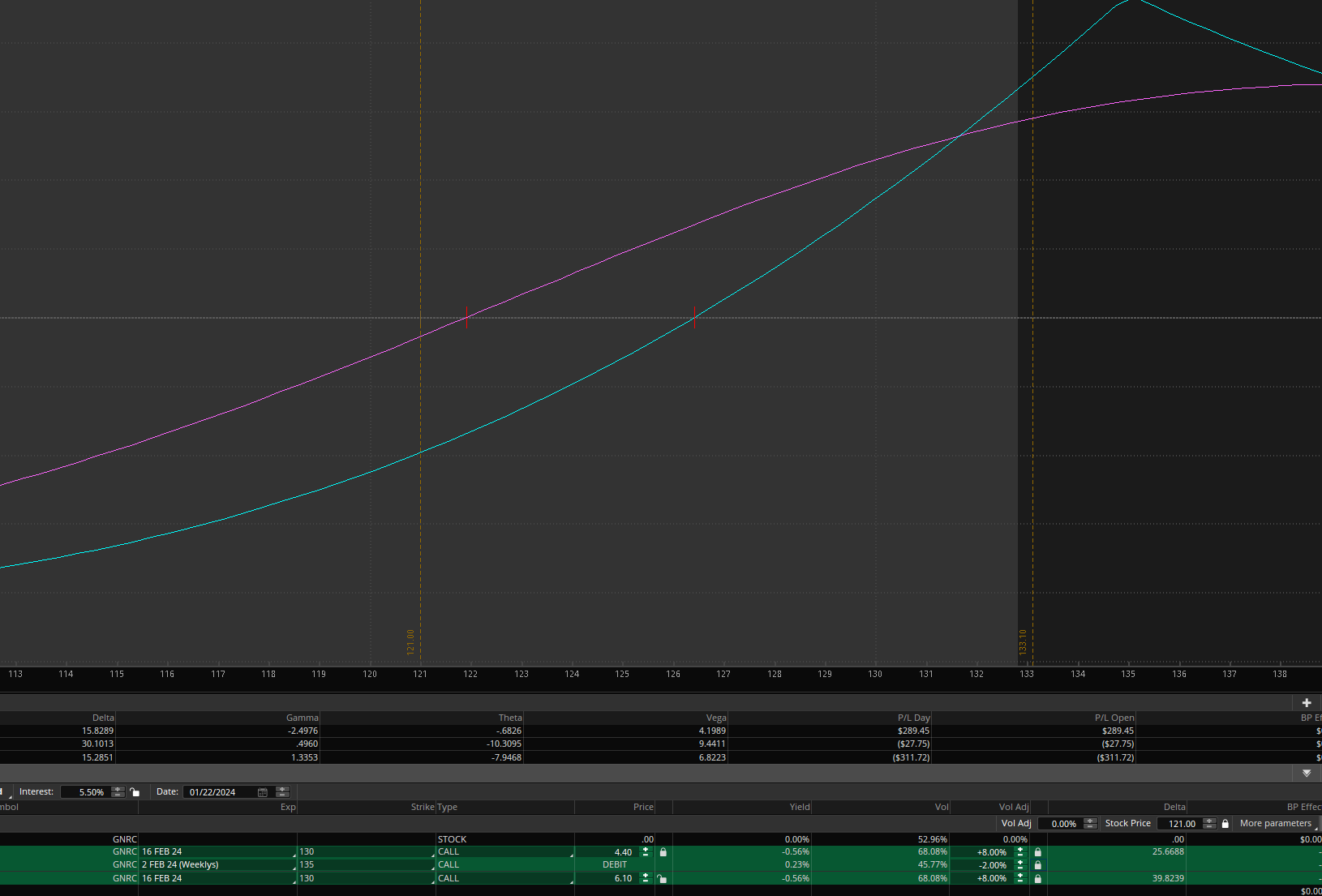 I am assuming that 22nd Jan, there is a 8% volatility increase in the Feb 16th expiration because we are approaching earnings. This volatility will keep rising. But GNRC does not go higher but instead goes lower to 121 level then how does this diagonal fare compared to only a long call.
