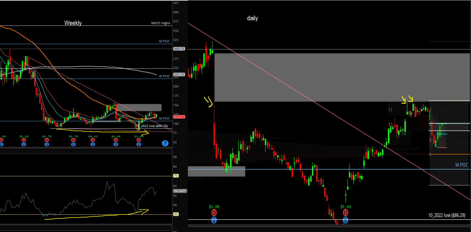 The daily chart also shows that multiple times GNRC came close to the 131 price level and has gotten rejected. After a couple of tries if it gets over the value area high which is above 131.33 then we could potentially see, GNRC try to fill the earnings gap from Dec 2022.