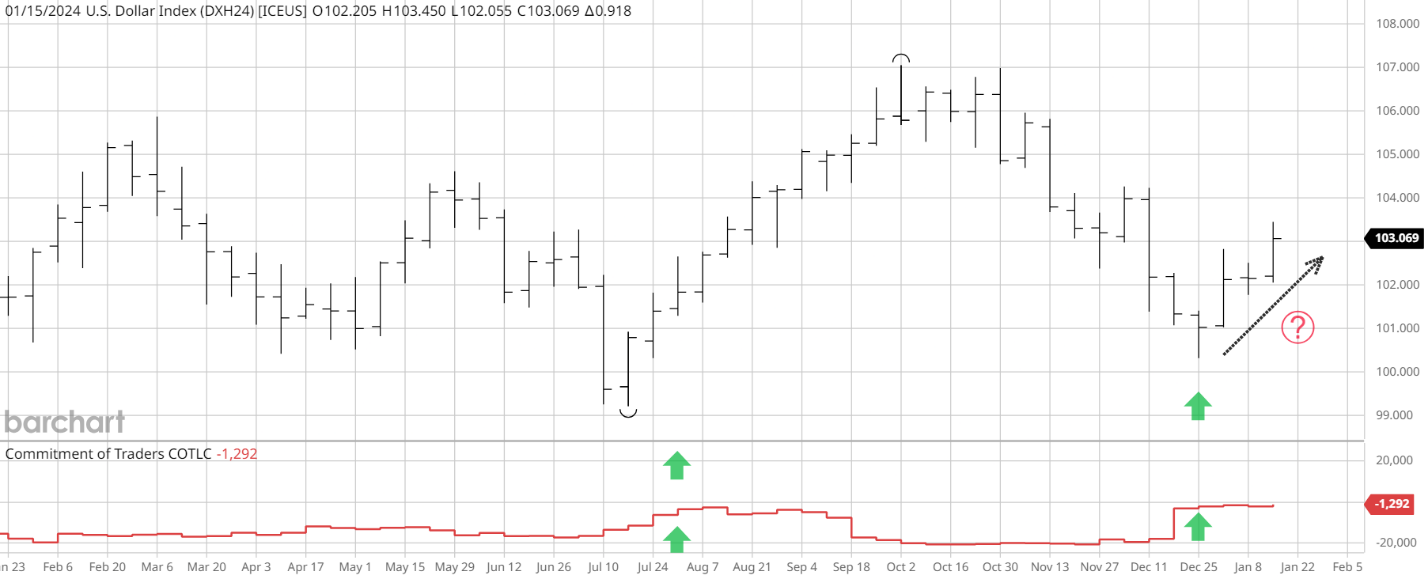 The weekly continuous US dollar index chart and the COT report show that commercial traders (red line) in the dollar index market are more bullish than ever in the past 52 weeks. The last time commercial traders were this bullish on the US dollar index was July 2023, resulting in an 8% price increase (green arrows). Another positive is the recent accumulation occurred at a higher price than in July.Â