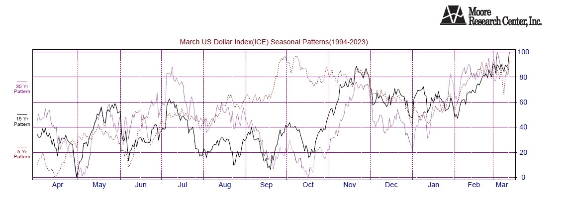 An interesting seasonal correlation exists between the US dollar rally in February and the yield on the 10-year Treasury Note rally from February to the end of March. The US Government must issue more debt to raise cash for income tax refunds by the April 15 tax deadline. Higher yields - stronger dollar is a typical market correlation.Â