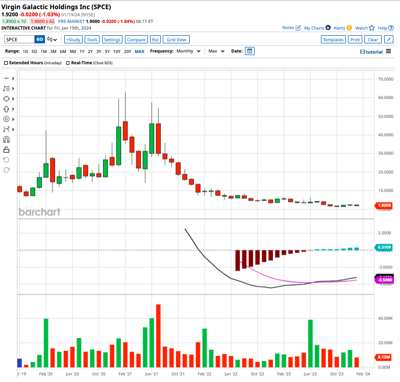 Shares of Virgin Galactic Holdings (SPCE) have taken shareholders on a roller-coaster ride in the last few years. The stock rocketed all the way from $7.29 in December 2019 to more than $50 in June 2021. Today, Virgin Galactic stock is priced at $2.04, valuing the company at $767 million by market cap. Let’s see if the space tech stock can stage a comeback this year.