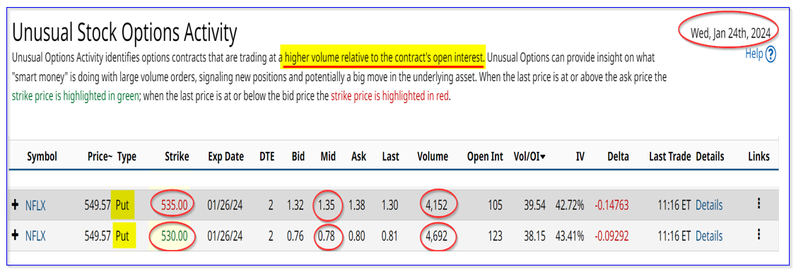 The Unusual Stock Options Activity Report published by Barchart today shows that large tranches in Netflix puts have been traded for the period ending Jan. 26, or two days from now. For example, over 4400 put contracts have traded at the $530 strike price and 3,684 put contracts have traded at the $535 strike price.