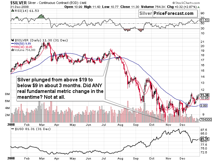 Silver price moved from above $20 to below $10 within a year, even though the above-mentioned fundamental characteristics and long-term potential of this market remained intact (so, those with silver in their IRAs are well positioned in my opinion).