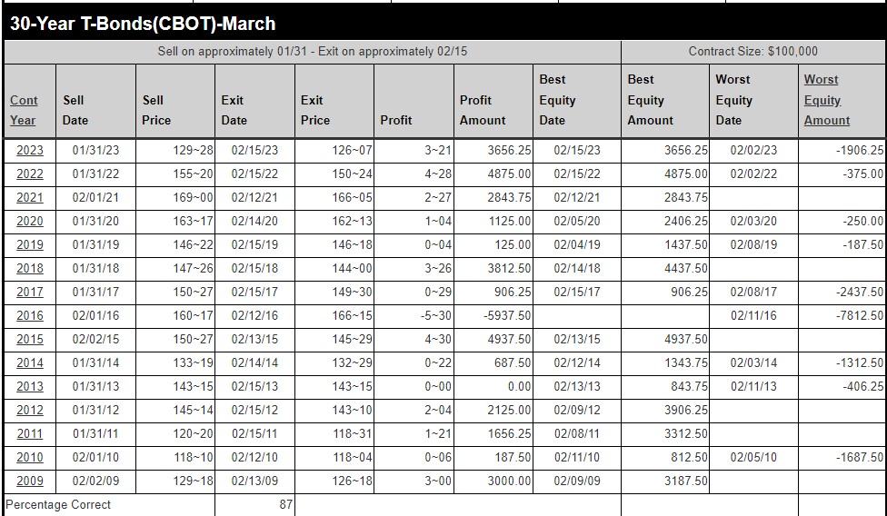Historically, the bearish seasonal window has found that the 30-year bond closed lower on approximately February 15 than on about January 31, 87% of the time during the past 15 years. The table below illustrates that during the last 15 years, six did not have a daily closing drawdown.