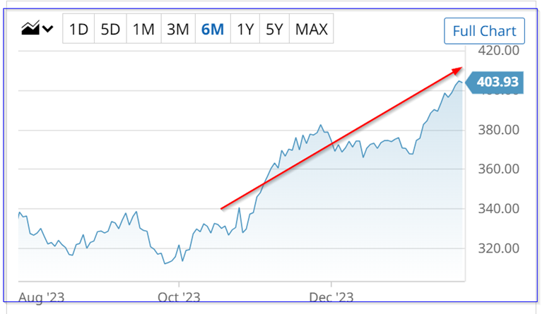 For example, MSFT stock is now over $400 at $403.93. It's already up 7.4% this month alone from $376.04 at the end of December 2023.