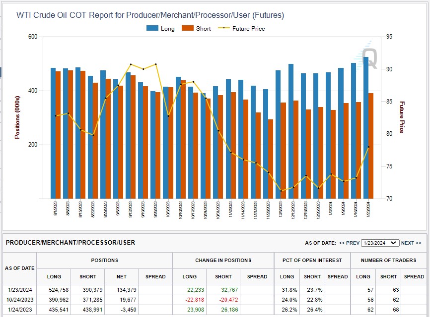 As we discussed earlier, the economy is showing growth, possibly leading to higher-than-normal demand for gasoline this year. The COT report reveals the refiners were buying crude oil (blue bars) as the price (yellow line) declined towards the low $70 per barrel. And, this is typical for commercial traders to scale into positions and not chase price.Â