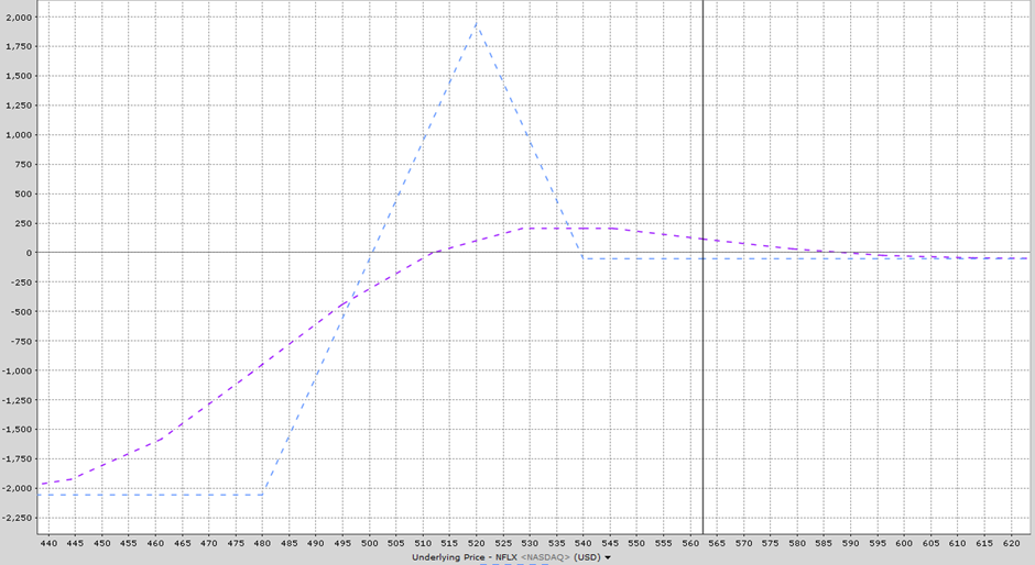 The trade starts with delta of 1, so has a very slight bullish bias to start, but that will flip to negative delta closer to expiry if NFLX is still above 520.