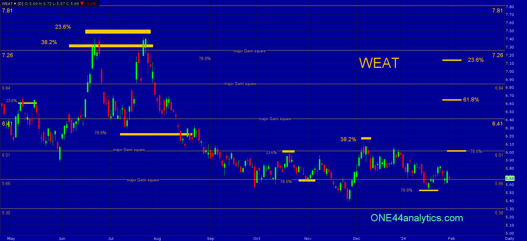 The next rally after making new lows in November of last year took it right to 38.2% on 12/6/23. It has yet to make a new low to keep the trend intact, however it has hit a 78.6% retracement. As the ONE44 78.6% rule says, any failure to make a new low after hitting a 38.2%, or 23.6% retracement in the area of a 78.6% retracement can be the start of the next Bull more, or at least send it 78.6% of where it just came from. The short term target on a rally from 5.55 is 6.00 (78.6%) this is also a major Gann square.