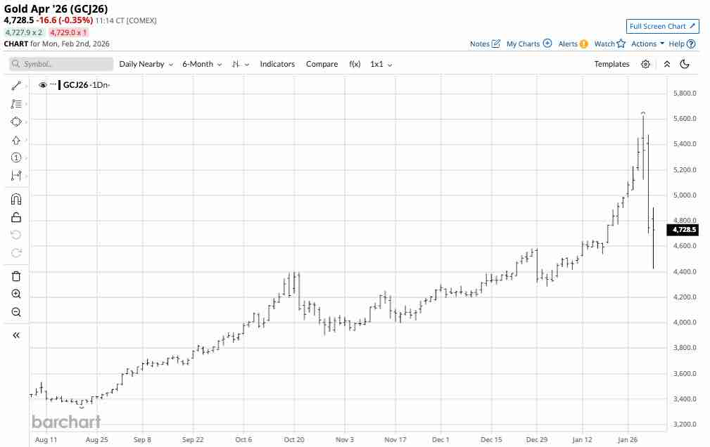 The six-month daily continuous COMEX gold futures chart highlights the precious metal’s ascent and parabolic move that took it to the high of $5,626.80 on January 29, 2026.Â