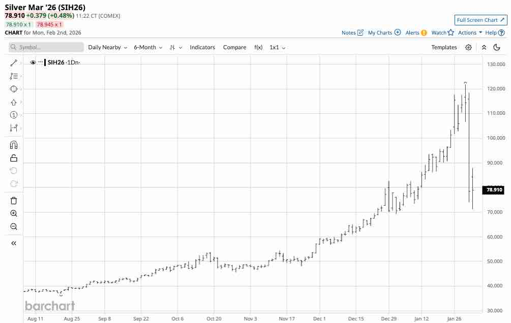 Sir Issac Newton’s Third Law of Motion states that for every action, there is an equal and opposite reaction. Gold and silver’s parabolic rallies have reached a frenzy, and while prices could continue to rise, the risk of ownership has increased dramatically. In a January 22, 2026, Barchart article on silver, I concluded with the following: