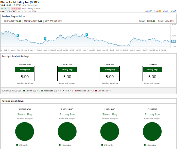 Blade Air Mobility’s stock has a consensus “Strong Buy” rating among analysts, with the mean price target of $7.50 signifying a potential upside of 149% to current levels. All 5 analysts covering the stock have given it a “Strong Buy” rating.