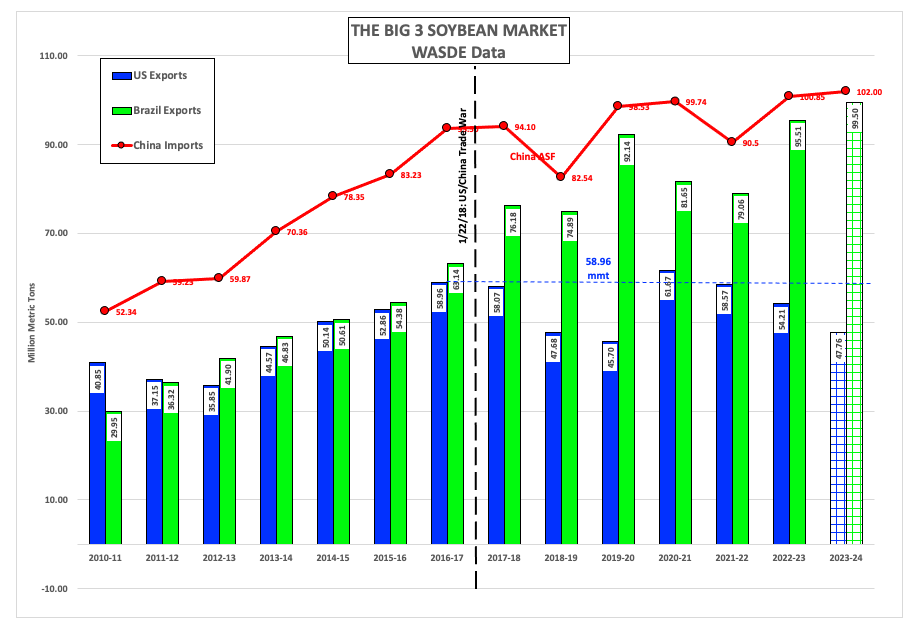 Ah yes, export demand. I’m sure we can all repeat the legendary Tweet by heart: “Trade wars are good, and easy to win.” But as usual, not everything that is posted on the X-site formerly known as Twitter is actually true. In this case, we can see the start of the Twitter-driven Trade War between the US and China was the demarcation point of the former being a great player in the global soybean market. The initial salvos were fired in January 2018, with the USDA showing 2016-2017 marketing year (yes, I know) exports for the US of 58.96 mmt only 7% behind Brazil’s estimated 63.14 mmt. In one year’s time the gap grew by 17 percentage points, with the January 2024 edition of WASDE guesses showing a 42% difference between the two. If the US sees demand pick up beyond February this year, it won’t be enough to make up this great gap. Additionally, through the end of January the US was showing total sales of 38.11 mmt, down 19% from the reported 47.14 mmt the same week the previous marketing year. The US was on pace to ship 300 mb less than last year, as compared to USDA's January guess of 237 mb less.