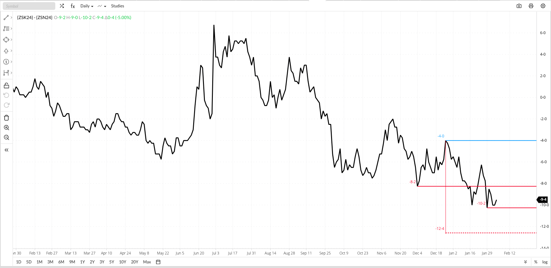 I recently wrote about how the most bullish factor in the soybean market (the Grains sector in general) was the noncommercial net-short futures position. Newsom’s Market Rule #6 tells us fundamentals win in the end, so we have to ask ourselves if soybean market fundamentals warrant a record large net-short futures position held by funds? National average basis is neutral at best in early February, with the first weekly calculation coming in at 53.75 cents under March futures as compared to the previous 5-year average weekly close for the week of 46.25 cents under and the previous 5-year low weekly close of 89.75 cents under March. The fact basis is neutral, and generally in its seasonal sideways trend, tells us there is no immediate concern over supply in relation to demand. In fact, last Friday’s National Cash Index (ZSPAUS.CM) came in near $11.35, correlating to an available stocks-to-use of 10.5%. This continues to be the largest as/u, based on monthly closes, since November 2020. But what about further out? The May-July futures spread closed Monday at a carry of 9.5 cents after flirting with its low daily close of 10.25 cents carry. The fact the spread has not extended its downtrend, at least not yet, and continues to cover a bullish level of calculated full commercial carry (less than 33%) tells us merchandisers may be looking for a later than normal seasonal increase in export demand.