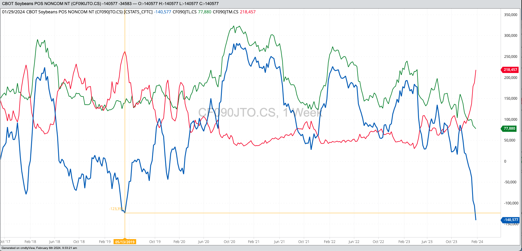 Newton’s First Rule of Motion Applied to markets that tells us, “A trending market will stay in that trend until acted upon by an outside force, with that outside force usually investment money[ii]”. Given this, let’s take a look at the latest CFTC Commitments of Traders report (legacy, futures only) chart for noncommercial positions as of Tuesday, January 30. Of all the CoT numbers and charts that came out last Friday, this was the one I was looking forward to the most, and it did not disappoint. Recall from Tuesday-to-Tuesday, March soybean futures (ZSH24) lost as much as 51.75 cents before closing 20.75 cents lower for the week. This told us funds had continued to add to their net-short futures position, and they had. Friday’s report showed a new record large of 140,577 contracts with shorts of 218,457 contracts the largest since the week of May 27, 2019. While this activity has pushed the market down, with March futures falling $2.31 from the November 15 high through this past Monday’s low, it also opens the door to a short covering rally. But why would funds start covering this position?