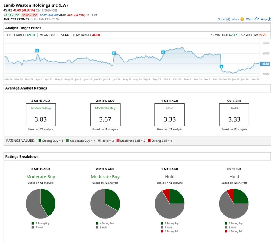 Among the 12 analysts covering LW stock, the consensus is a “Hold.” That’s based on three “Strong Buy” ratings, eight “Holds,” and one “Strong Sell.”