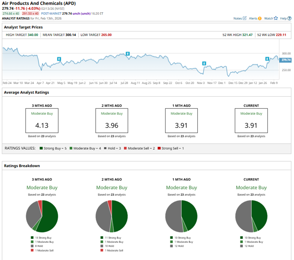 The mean price target of $300.14 represents a 7.3% premium to APD’s current price levels. The Street-high price target of $340 suggests a 21.5% potential upside.
