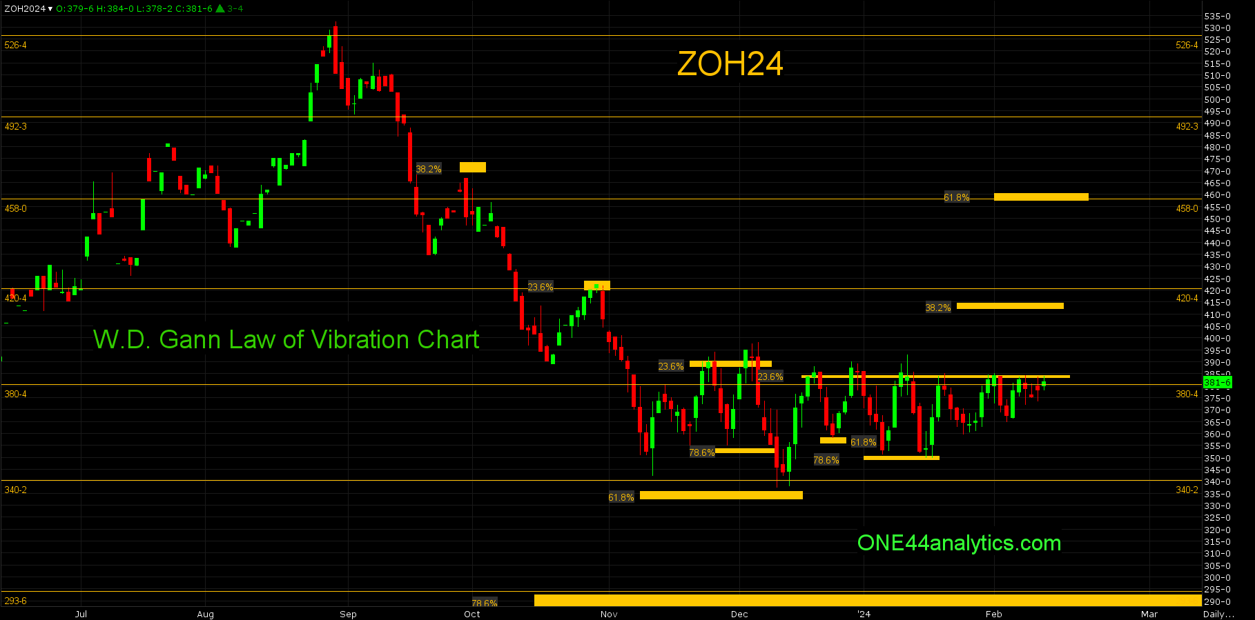 March Oats continue to trade up against 23.6% back to the contract high at 384.00. It has hit this level 7 times in the last 2 months and each setback from it has been smaller. It is very tightly wound up and looks to be ready to move quickly higher. One thing you have to watch out for is, a trade of 5 to 10 cents above 484.00 and a close right back below the 380.50 major Gann square, as this can cause a sharp selloff. With a solid close above 384.00 all the targets from the last update below remain the same.