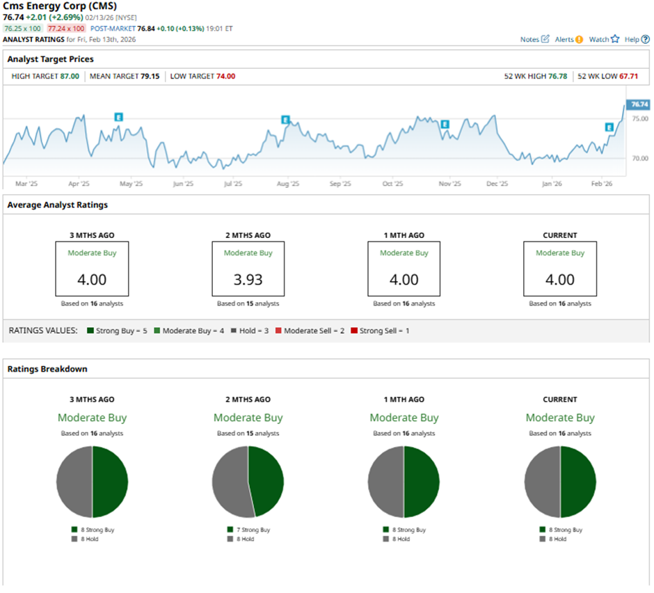 Shares of CMS Energy Corporation rose 1.8% on Feb. 5 after the company reported strong Q4 2025 results, with adjusted EPS of $3.61, up from $3.34 in 2024 and above guidance, driven largely by outperformance at NorthStar Clean Energy. Investor sentiment was further boosted as CMS Energy raised its 2026 adjusted EPS guidance to a range of $3.83 - $3.90 and reaffirmed long-term adjusted EPS growth of 6% to 8%.