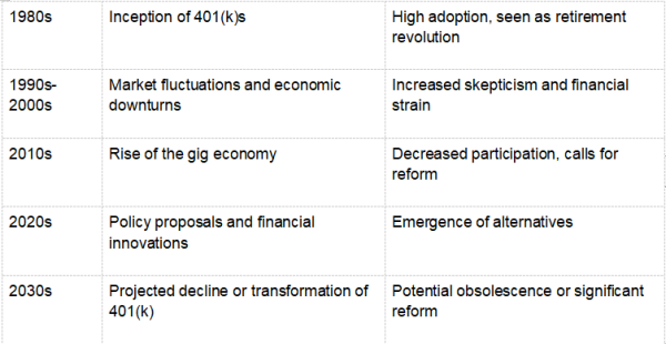 This table encapsulates the trajectory of 401(k)s from their introduction to the present day, highlighting key events that have shaped their evolution and the factors contributing to their potential decline.