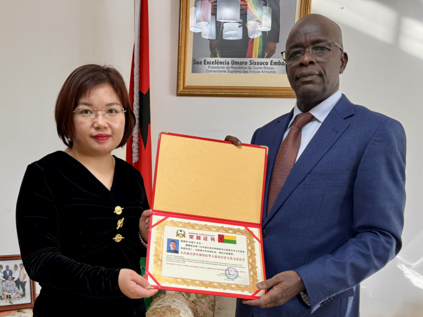 António Serifo Embaló, plenipotentiary ambassador of the Republic of Guinea-Bissau to China, representing the Republic of Guinea-Bissau and President Umaro Mokhtar Sissoco Embaló, as well as Prime Minister Rui Duarte de Barros, expresses gratitude to Lingyun Xiang, who has made outstanding contributions to bilateral economic, trade relations, economic and cultural exchanges between Guinea-Bissau and China.