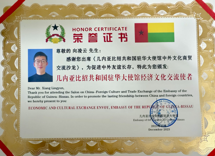 On December 29, 2023, António Serifo Embaló, the plenipotentiary ambassador of the Republic of Guinea-Bissau to China, on behalf of the Republic of Guinea-Bissau, appointed Professor Lingyun Xiang as the envoy for Economic and Cultural Exchange between Guinea-Bissau and China.