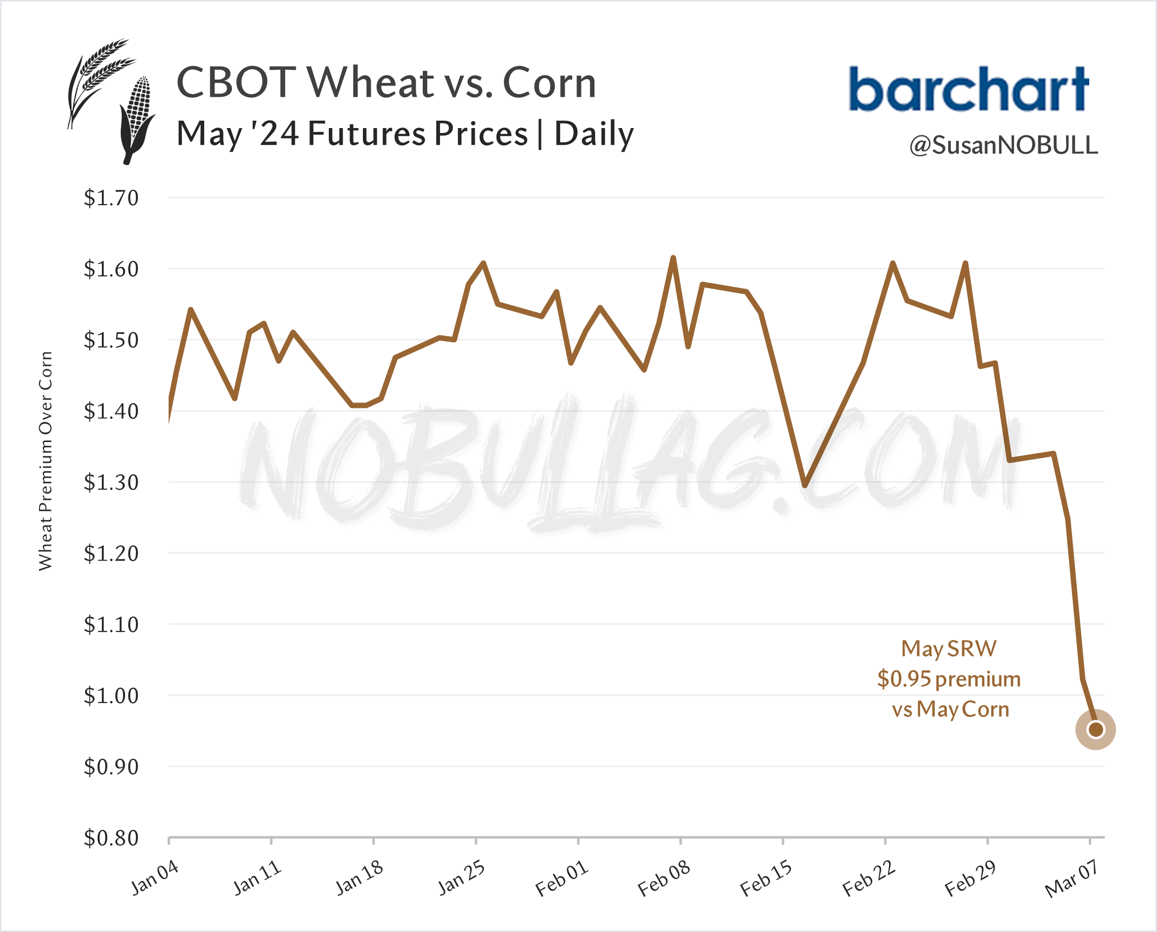 Wheat has been under pressure in recent weeks amid heavy world markets. Chicago’s recent 50-cent fall in combination with corn’s 30-cent rally has sent soft red wheat’s premium over corn to its lowest since November.