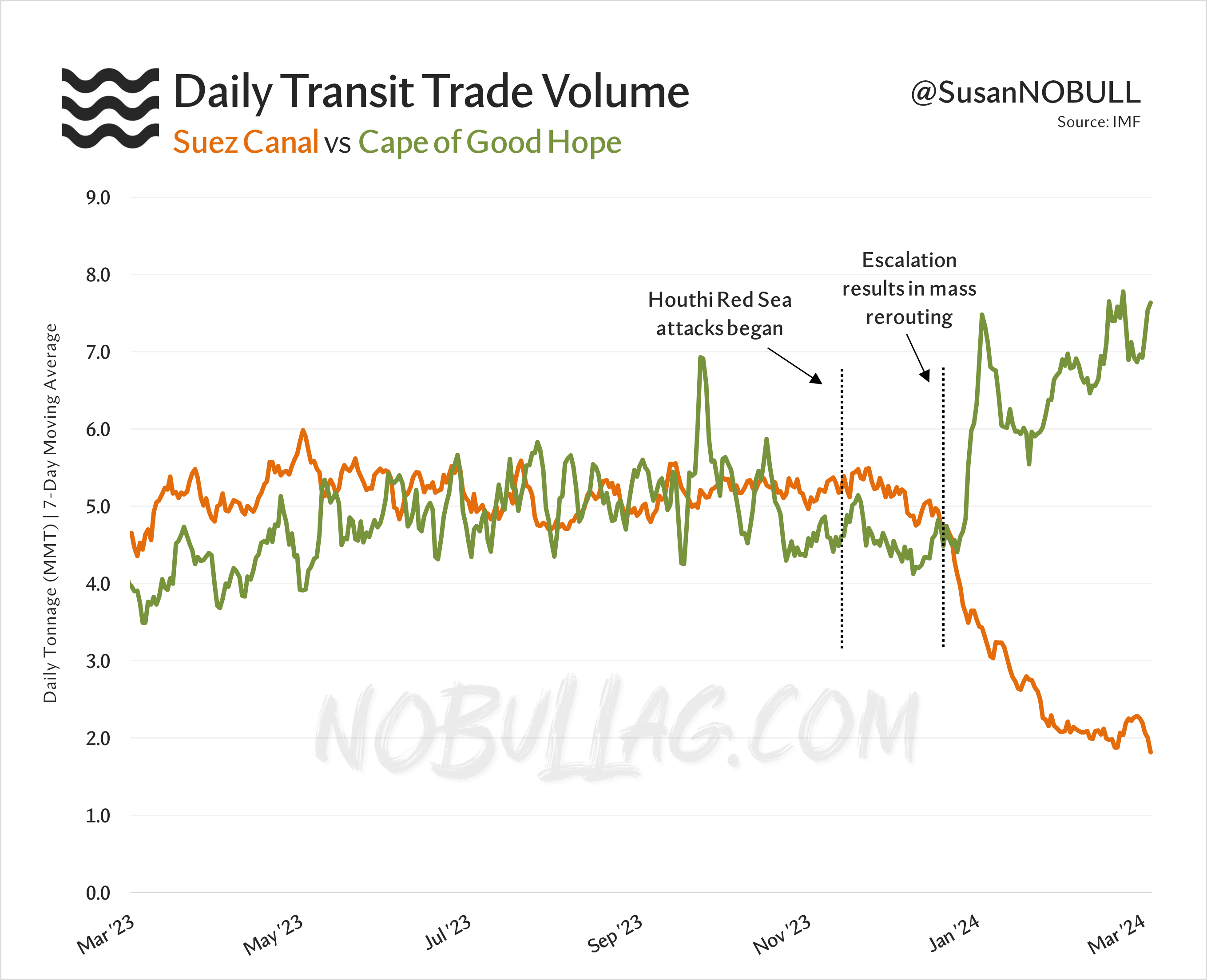 Daily tonnage through the Suez Canal has fallen 62% since the end of December, while transits around the Cape of Good Hope have increased 61%.