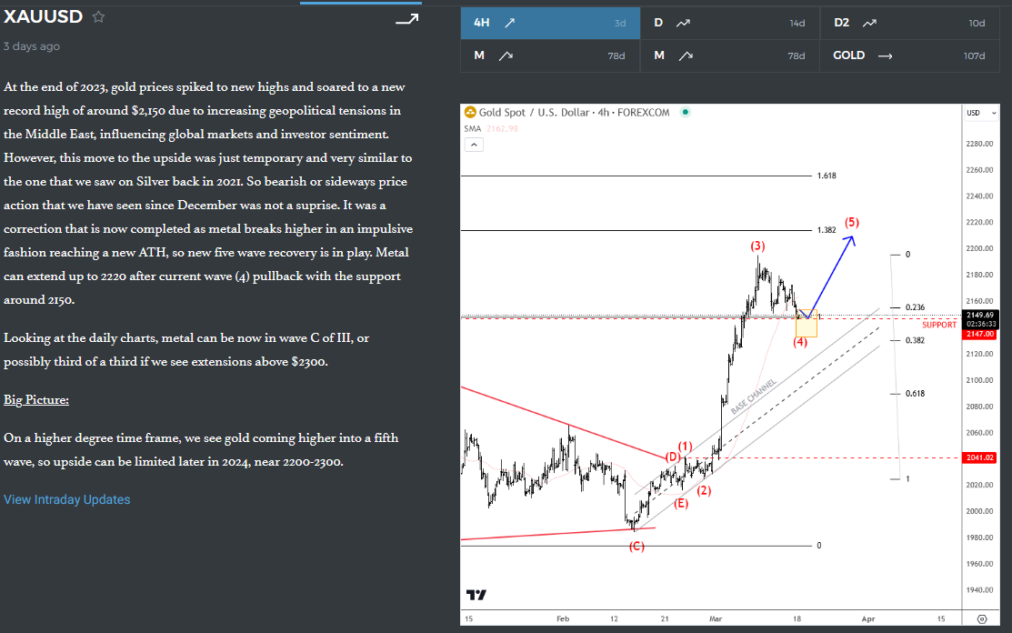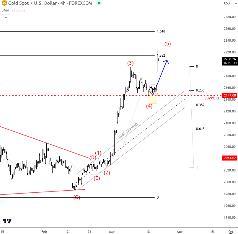 Gold (XAUUSD) faced an impulsive rally into new all-time highs recently and just 3 days back we mentioned and highlighted about an ongoing bullish impulse in the 4-hour chart. We warned our members about a corrective pullback in wave (4) with ideal support around 2150, which was also previous all-time highs level.