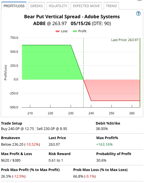 If Adobe stock closes above $240 on the expiration date the trade loses the full $380.
