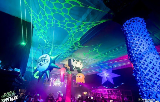 Featured is Trippy Creation’s 4m UV Green Stretchy Web installed in a nightclub