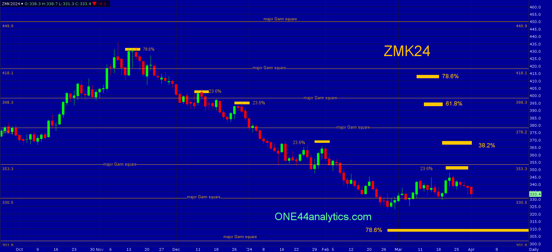Above it, look for 38.2% back to the 11/8/23 high at 367.00. Any rally that can't get above 23.6% at 353.30 keeps the trend extremely negative, this is also a major Gann square.