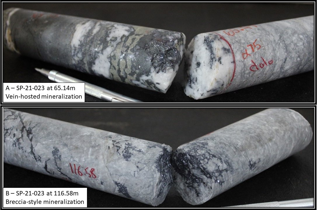 - 4,413.58 g/t Aq Eq, comprised of 1,572 g/t Ag, 5.84% Cu, 29.2% Zn, 0.55 g/t Au, 7.8% Pb, & 2.47% Sb, over 0.34 m, within a broader interval of 239.27 g/t Ag Eq comprising 0.1 g/t Au, 83 g/t Ag, 0.3% Cu, 0.53% Pb, 0.13% Sb, & 1.48% Zn over 6.86 m in hole SP-21-023 beginning at 65.14 m downhole; and