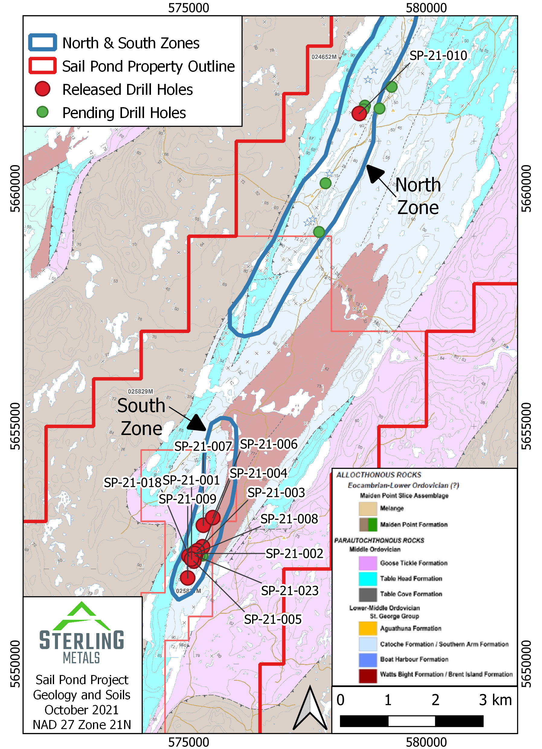 Mathew Wilson, CEO of Sterling Metals, commented: "The discovery of massive to semi-massive sulfides bearing very high grades is a confirmation of the tremendous potential contained in the Sail Pond Project. This portion of the South Zone is still only a small portion of the 12 km trend. With local drilling confirmation of our surface sample grades now in place, we can be more confident in the district potential of this project, where promising surface sample metal grades are found along the entirety of the trend. As we gain a better understanding of this small area of the entire holding, we advance our understanding of the Project as a whole…".