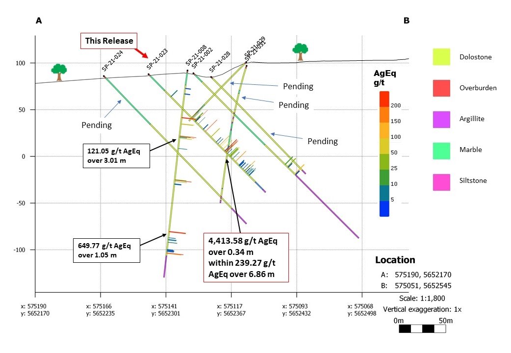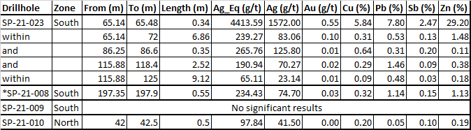 - 190.94 g/t Ag Eq over 2.52 m, comprised of 70.27 g/t Ag, 0.29% Cu, 1.46% Pb, 0.02 g/t Au, 0.09% Sb, & 0.38% Zn, in hole SP-21-023 beginning at 115.88 m downhole.