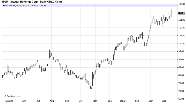The Barchart Chart of the Day belongs to Integer Holdings (ITGR).  I found the stock by using Barchart.com to find the "Barchart New Highs" page, and then I clicked on pull-down to select stocks with new 52-week highs. I then viewed the stocks on the list with the FlipCharts feature.Â