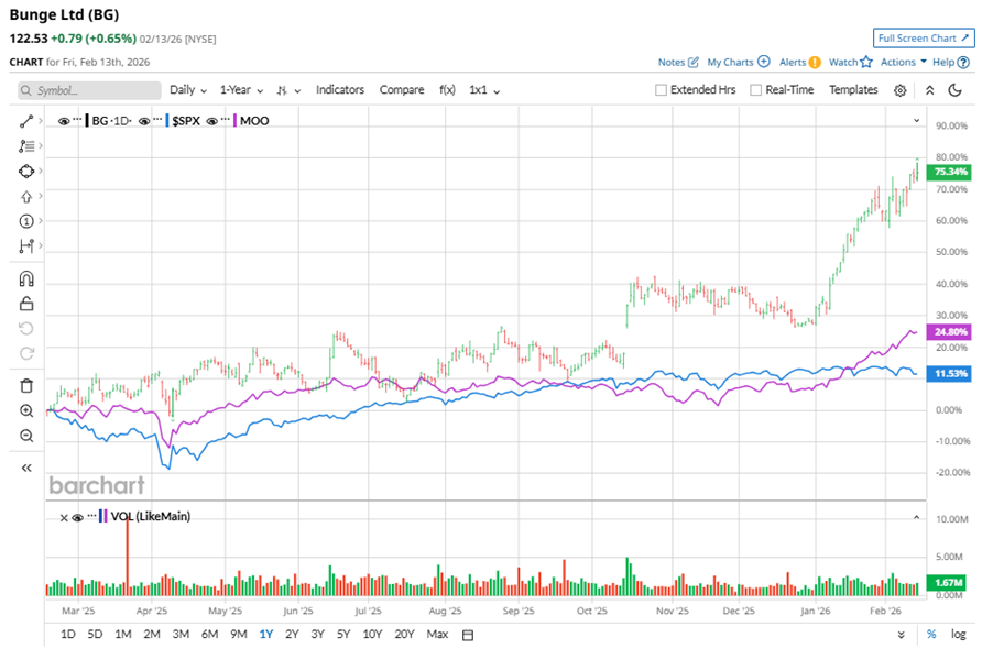 Shares of this global agribusiness and food company have outperformed the broader market considerably over the past year. BG has gained 75.6% over this time frame, while the broader S&P 500 Index ($SPX) has rallied nearly 11.8%. In 2026, BG stock is up 37.6%, surpassing the SPX’s marginal fall on a YTD basis.