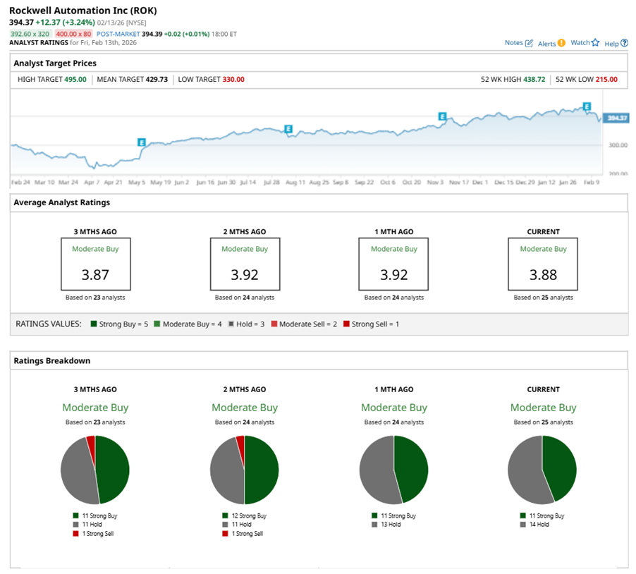 On Feb. 10, Mizuho Financial Group, Inc. (MFG) analyst Brett Linzey maintained a “Hold” rating on ROK and set a price target of $400, implying a potential upside of 1.4% from current levels.