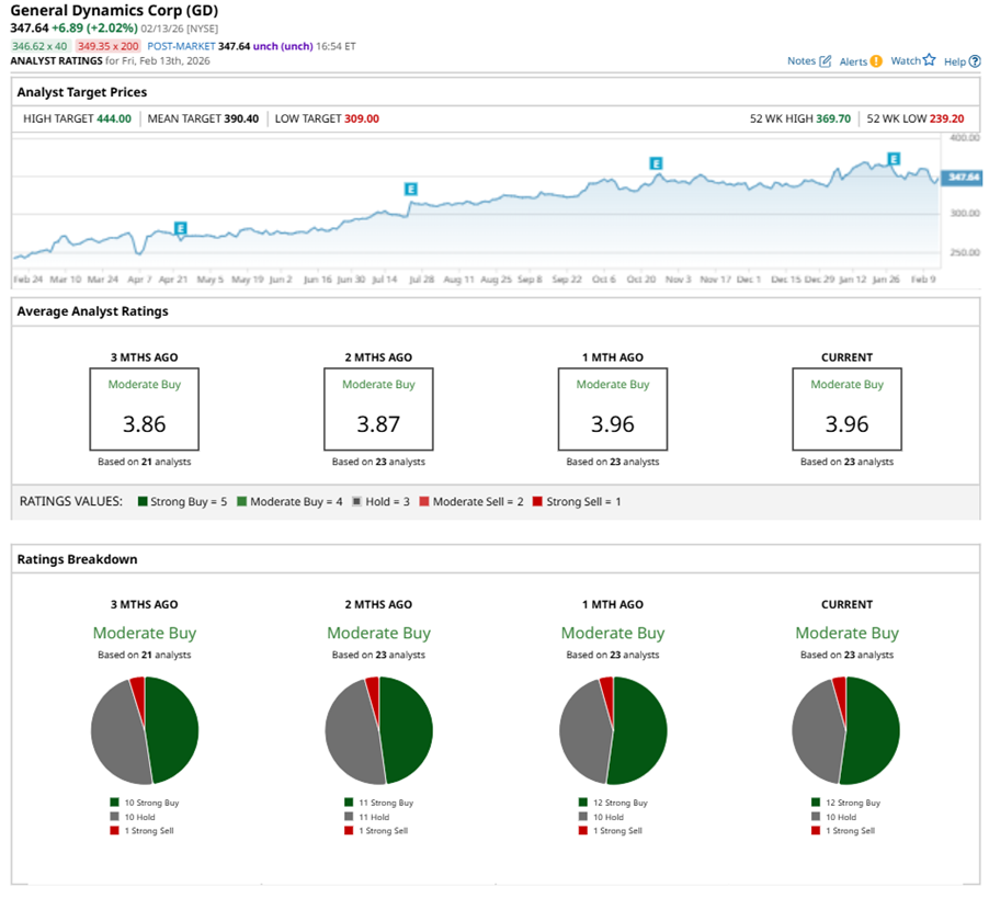 On Feb. 1, Jefferies Financial Group Inc. (JEF) analyst Sheila Kahyaoglu kept a “Hold” rating on GD and raised the price target to $385, implying a potential upside of 10.7% from current levels.