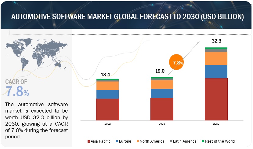 The global automotive software market size is projected to grow from USD 19.0 billion in 2023 to USD 32.3 billion by 2030, at a CAGR of 7.8%. Rapid integration of ADAS features in vehicles, and increasing adoption of connected car services, paired with rising deployment of ECUs and domain controllers in vehicles are anticipated to increase the demand for automotive software all over the world.