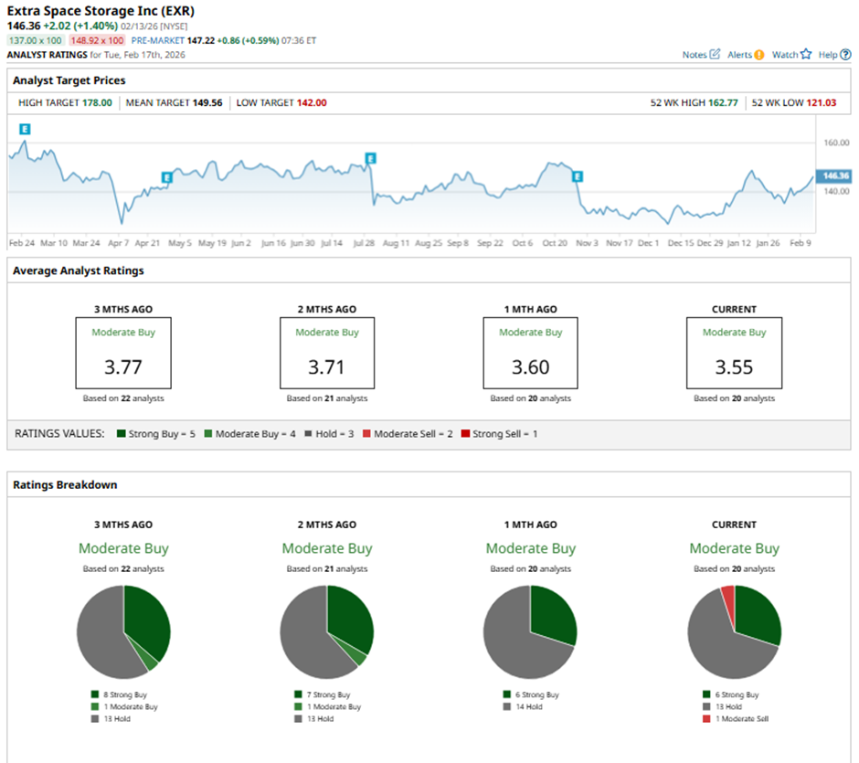 The mean price target of $149.56 represents a 2.2% premium to EXR’s current price levels. The Street-high price target of $178 implies a potential upside of 21.6% from the current price.