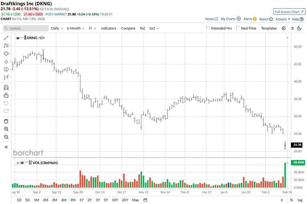 DraftKings (DKNG) says record performance in Q4 helped it report its first-ever annual profit in 2025. Shares still crashed 13% late last week as investors reacted to its lukewarm guidance for the full year.
