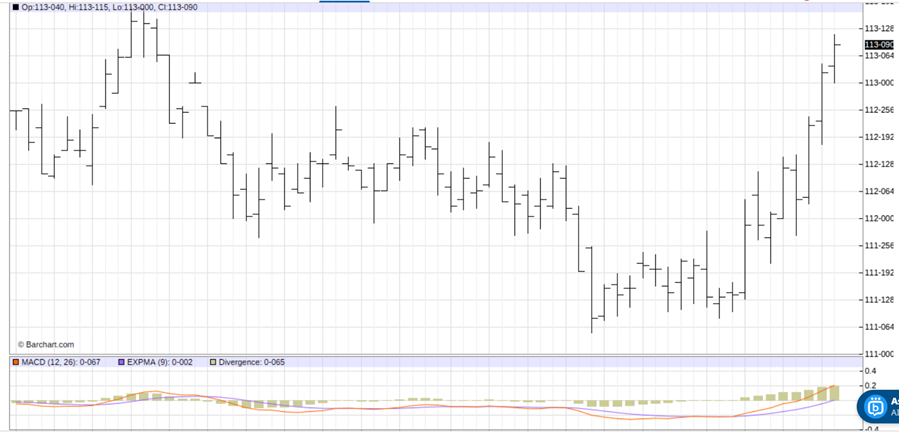 See on the daily bar chart for the June T-Note futures that prices are trending higher and today hit a 2.5-month high. See, too, at the bottom of the chart that the moving average convergence divergence (MACD) indicator is also in a bullish posture, as the blue MACD line is above the red trigger line and both lines are trending higher.