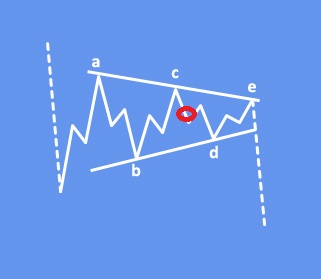 A triangle appears to reflect a balance of forces, causing a sideways movement that is usually associated with decreasing volume and volatility. The triangle pattern contains five overlapping waves that subdivide 3-3-3-3-3 and are labeled A-B-C-D-E. The running triangle is a region of horizontal price movement, a consolidation of a prior move, and it is composed of “threes.” That means each of the A-B-C-D-E waves have three subwaves. The triangle pattern is generally categorized as a continuation pattern, meaning that after the pattern completes, it’s assumed that the price will continue in the trend direction it was moving before the pattern appeared. Keep in mind that triangles can be tricky sometimes and we may see a break in other direction first before a trend continution, so it’s important to wait on confirmations. Triangles indicate that the final leg is coming before a reversal and that’s why triangles are labeled in wave B, wave X or wave 4.