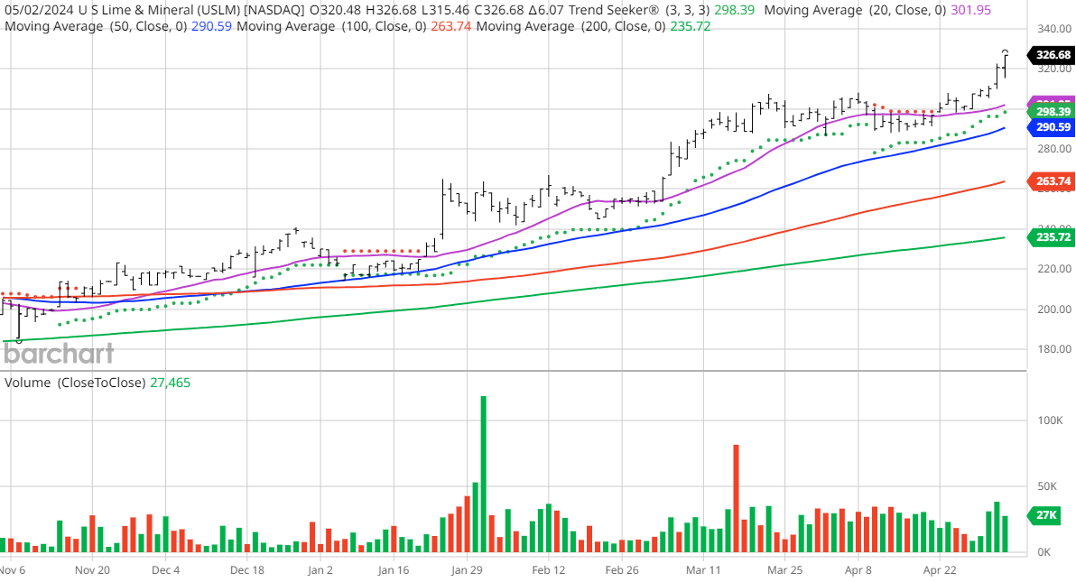 The Chart of the Day belongs to the basic material company US Lime & Minerals (USLM).  I found the stock by using Barchart's powerful screening functions to find stocks with the highest technical buy signals, highest Weighted Alpha, superior current momentum and having a Trend Seeker buy signal then used the Flipchart  feature to review the charts for consistent price appreciation. Since the Trend Seeker signaled a buy on 4/ 22 the stock gained 8.76%.