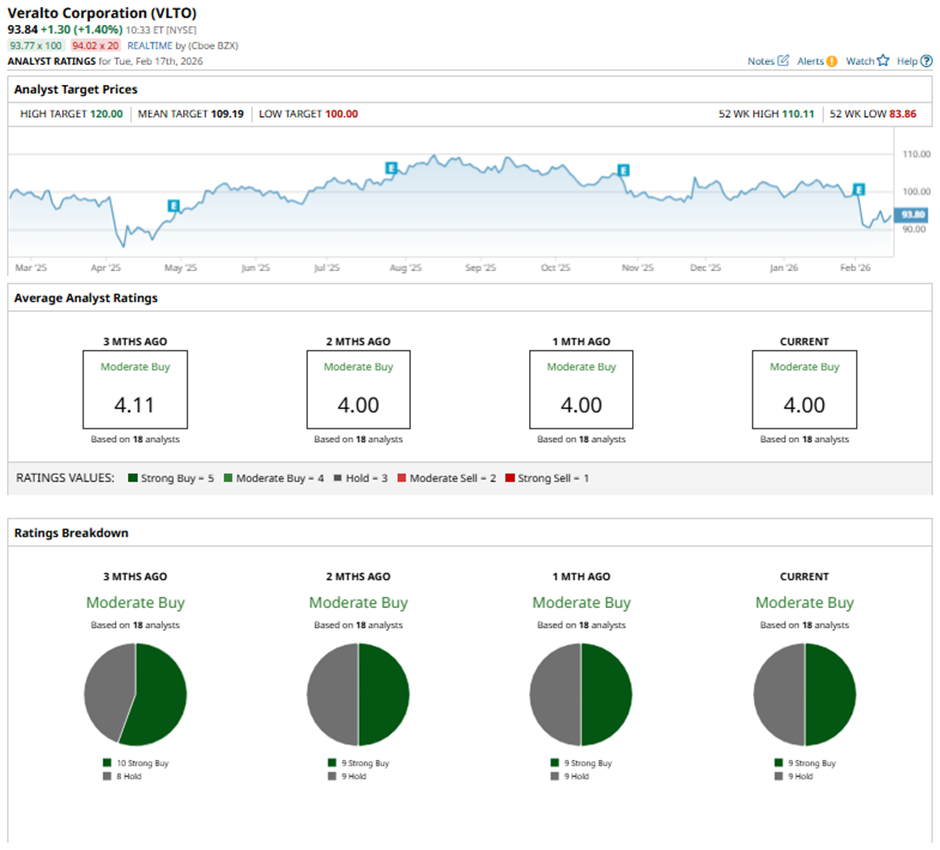 The mean price target of $109.19 represents a premium of 16.4% to VLTO's current levels. The Street-high price target of $120 implies a potential upside of 27.9% from the current price levels.