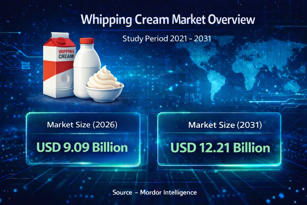 The global whipping cream market size is projected to grow from USD 9.09 billion in 2026 to approximately USD 12.21 billion by 2031, reflecting steady expansion during the forecast period. Rising demand in home baking, specialty coffee beverages, and dessert applications continues to support long-term whipping cream market growth.