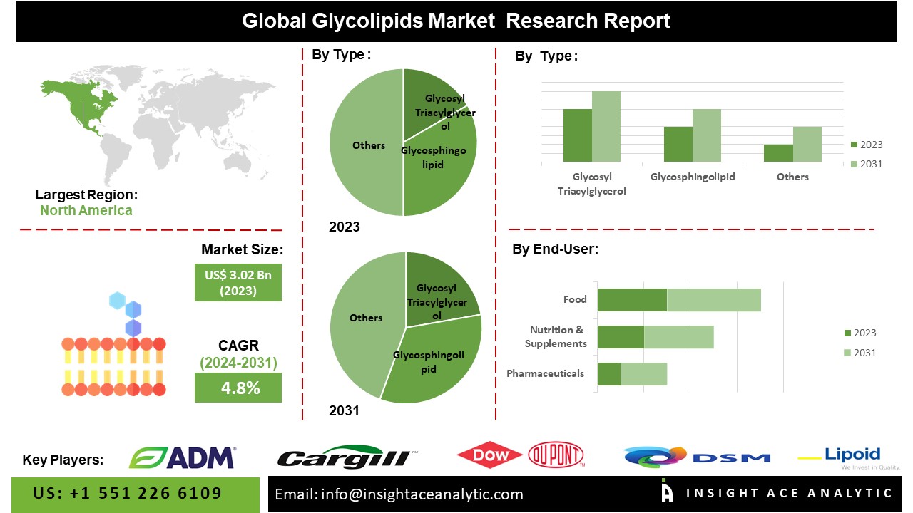 InsightAce Analytic Pvt. Ltd. announces the release of a market assessment report on the "Global Glycolipids Market – (By Type (Glycosyl Triacylglycerol, Glycosphingolipid, and Others), By Application (Food, Nutrition & Supplements, Pharmaceuticals, and Others)), Trends, Industry Competition Analysis, Revenue and Forecast To 2031."
