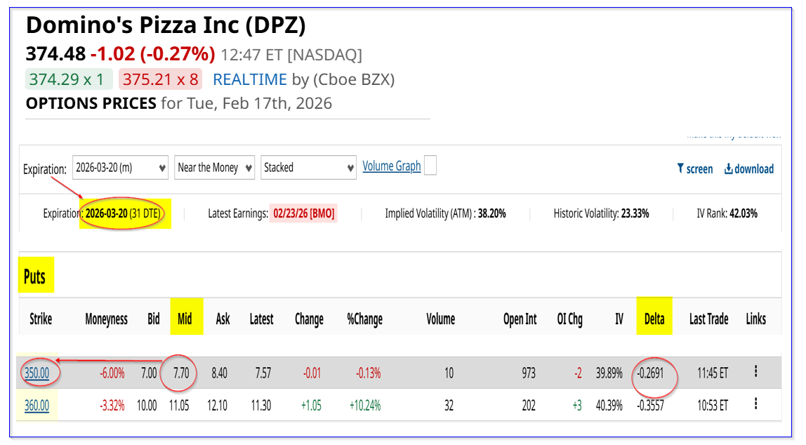 As long as DPZ stays over the $342.30 breakeven point (i.e., $350-$7.70), which is 8.59% lower than today's price, by March 20, the investor makes this full 2.20% monthly yield.