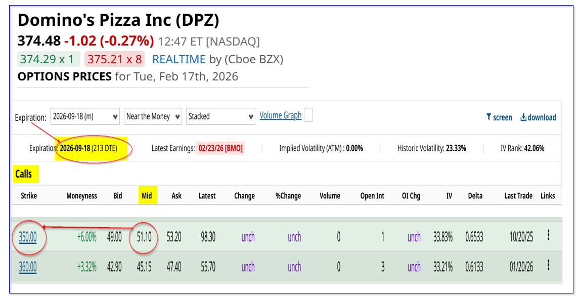 So, as long as DPZ stays over $350.00, the investor could make a huge leveraged return.